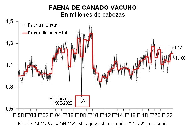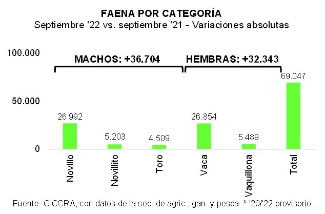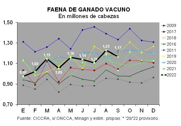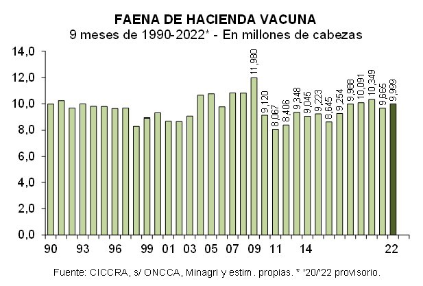 Al considerar los primeros nueve meses del año, la faena total ascendió a 10,0 millones de cabezas de hacienda vacuna y superó en 3,5% al total faenado en enero-septiembre de 2021.
