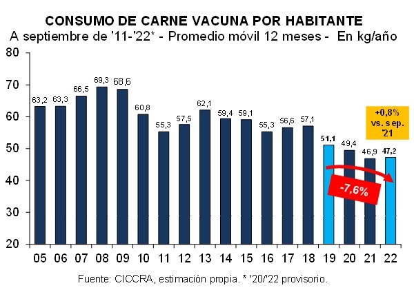 En el noveno mes del año el consumo por habitante promedio de doce meses se ubicó en 47,2 kg/año. Este fue 0,8% superior al promedio de doce meses atrás (+0,4 kg/hab/año). En tanto, al comparar con el guarismo de septiembre de 2019, se observó una caída de 7,6%.
