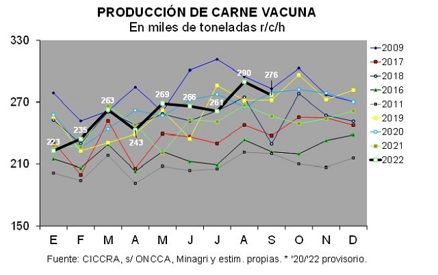Al considerar el período enero-septiembre de 2022, la producción de carne vacuna sumó un total de 2,325 millones de tn r/c/h, volumen que se ubicó 4,9% por encima del total producido en los primeros nueve meses de 2021.