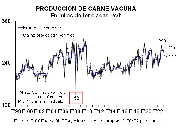 Al considerar el período enero-septiembre de 2022, la producción de carne vacuna sumó un total de 2,325 millones de tn r/c/h, volumen que se ubicó 4,9% por encima del total producido en los primeros nueve meses de 2021. Puesto en la perspectiva histórica, se ubicó en el puesto Nº 6. El peso promedio en gancho se ubicó en 233 kilos por cabeza y exhibió un incremento de 1,4% anual.
