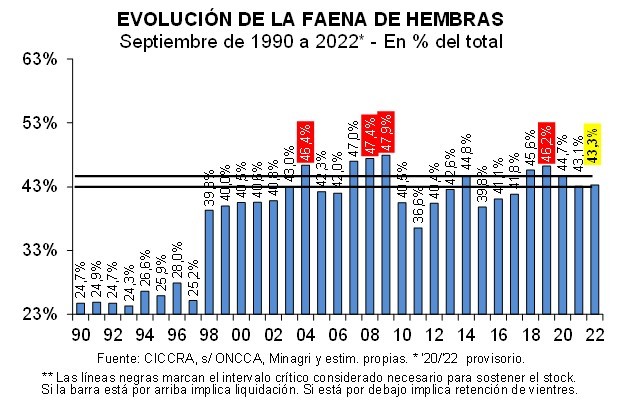 Debido a las distorsiones que generó la restricción de exportación de cortes de vaca entre mayo y agosto de 2021, luego morigerada parcialmente, la comparación interanual mostró un avance de 15,1% en la faena de vacas y un retroceso de la faena de vaquillonas de 0,9% anual. Todo esto hizo que la importancia de las hembras bajara a 45,4% de la faena total, recortando el incremento interanual a 0,8 puntos porcentuales.