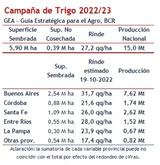 La caída interanual de producción triguera argentina se calcula en un 34,8%, considerando los 23 Mt que produjo el país en el anterior ciclo. El guarismo de octubre señala para el trigo una producción estimada de 15 Mt. Se tiene en cuenta un área pérdida de casi 400.000 ha y un rinde promedio de 27,2 qq/ha, casi 8 quintales menos que en el 2022 y 4 quintales menos que la media productiva nacional.