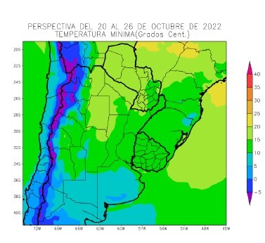 • El centro del NOA, el este de Cuyo, la mayor parte de la Mesopotamia, el norte de la Región Pampeana y la República Oriental del Uruguay observarán temperaturas mínimas entre 10 y 15°C, con focos con valores superiores y otros inferiores.