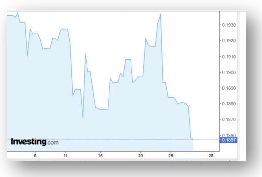 Abajo, se puede observar cómo el real ha ido perdiendo fortaleza frente al dólar, a lo largo de octubre. Este depreciación de la moneda brasileña juega en contra del precio de los granos y, obviamente, de la soja.