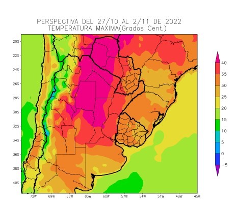 La primera etapa de la perspectiva comenzará con tiempo fresco, producto de la entrada de aire polar en los días precedentes, pero los vientos del trópico retornarán con vigor, aportando humedad y produciendo temperaturas máximas superiores a lo normal en el norte y el centro del área agrícola, pero sin lograr llegar al sur.