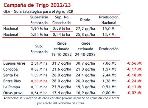 En la región central hay más daños en rinde y en área no cosechada que surgen de los nuevos monitoreos a dos semanas del evento de heladas del 9 de octubre. Se ha actualizado el rinde de región núcleo de 18 qq/ha de promedio a 15 quintales. Los nuevos ajustes alcanzan a Buenos Aires, Córdoba, Santa Fe, Entre Ríos y en el norte y oeste de Argentina. En Entre Ríos, según el SIBER (Bolsa de Cereales de Entre Ríos) se han restado 50.000 ha al área sembrada con trigo.