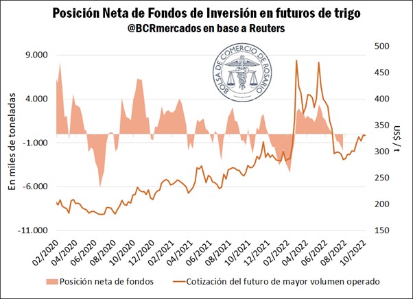 Sin embargo, esta posición podría revertirse como sucedió en marzo del corriente año, si el actual corredor de granos ucraniano en el Mar Negro no se renueve pasado el 19 de noviembre, haciendo que los precios del trigo vuelvan a escalar y lleven a los fondos de inversión a una posición neta compradora. Como se ilustra en la siguiente imagen, el mercado reacciona de manera dual, entre el efecto bajista de la desaceleración de la economía mundial y la emergencia alimentaria, y el efecto alcista de la crisis geopolítica y la posibilidad de nuevos bloqueos en el corredor.