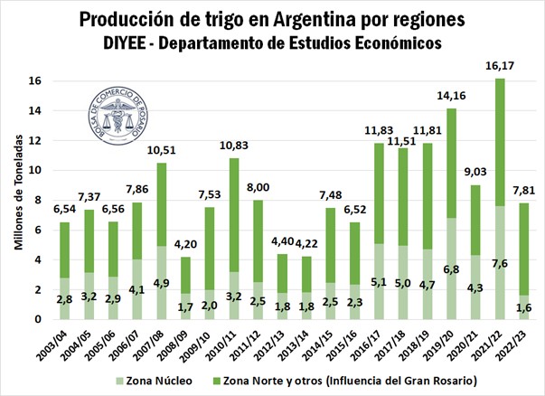 En este sentido, la zona núcleo exhibe la baja más pronunciada, definiéndose como la menor producción de la región en 8 años y representado una caída productiva del 55% respecto del ciclo actual. Además, las exportaciones proyectadas desde el Gran Rosario son menos de la mitad que el volumen de la 2021/22, y la molienda es casi un 10% inferior.
