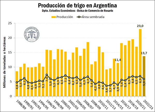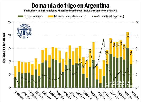 El ciclo nuevo tendrá un saldo proyectado de demanda a distribuir entre la exportación y la molienda que abarca casi 9 Mt para la primera y 5,6 Mt para la segunda, habida cuenta de que el recorte productivo pegará fuerte tanto a un sector como al otro. Con un consumo de trigo para la molienda relativamente más inflexible, las compras del sector exportador encontrarán un techo de poco más de la mitad del volumen negociado en la 2021/22. En tanto que, el consumo del sector molinero quedaría acotado a 0,4 Mt/mes, un 20% por debajo de las actuales necesidades de materia prima del sector (0,5 Mt/mes).