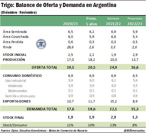 El desalentador resultado acompaña a las estimaciones del cereal argentino y estando a un mes del inicio oficial de la campaña 2022/23, los números ponen de manifiesto el costo de oportunidad que significa para el país los lotes que se siguen perdiendo a causa de las últimas heladas. Al 27/10, la proyección productiva para el ciclo próximo es de 13,7 Mt, con un rinde promedio de 25,6 qq/ha y unos stocks finales que caen a 1,3 Mt, el volumen más bajo comparado con el promedio de los últimos 5 años. En el siguiente cuadro se exponen los principales rubros de la oferta y la demanda por campaña.