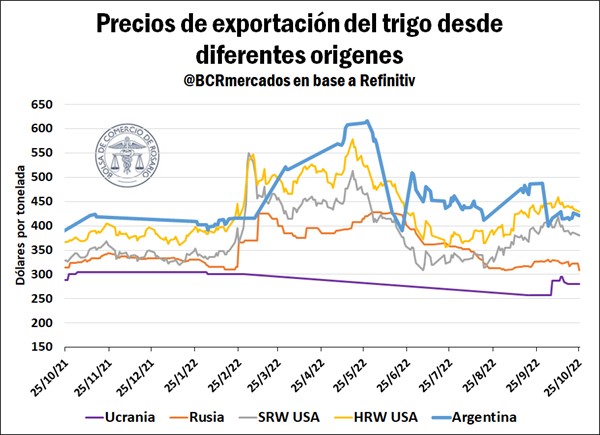 Para clarificar este último punto, en el siguiente gráfico se exponen los precios de exportación del trigo durante los últimos 10 meses, según diferentes orígenes.