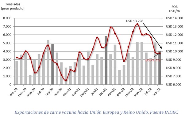 En el caso de Unión Europa, la caída de valores es aún más pronunciada. El conjunto de lo embarcado a ese destino -incluyendo Reino Unido- arroja un precio promedio de USD 9.772 desde un máximo alcanzado en abril de USD 13.298 por tonelada en junio. Aunque, tomando como referencia uno de los conjuntos más vendidos y de mayor valor comercial como es el Ramp & Loin, la caída de precios desde abril a la fecha supera el 35%, al pasar de referencias de USD 17.000 a USD 11.000 por tonelada para dicho producto.