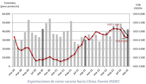 En el caso de China, si tomamos la integración actual de sus compras, el promedio ponderado por tonelada embarcada en septiembre (USD 4.659) resulta 10% inferior a lo pagado en mayo, cuando las ventas a este destino marcaron un máximo de USD 5.161 por tonelada embarcada. Sin embargo, si tomamos como referencia uno de los cortes más populares como es el Shing & Shang, vemos que la caída asciende a un 25%, pasando de los USD 8.000 por toneladas pagados en abril a una referencia de USD 6.000 a fin de septiembre.