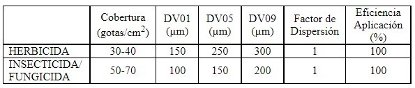 En un equipo PLA John Deere, que usualmente aplicaba 100 l/ha para tratamientos de fungicidas e insecticidas, se colocaron boquillas HCX CONO HUECO 003 John Deere y se calibró el equipo para aplicar a 15 l/ha, buscando estar cerca de los siguientes valores ideales: