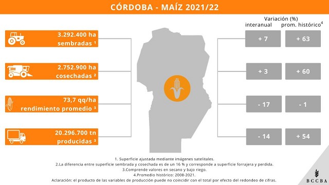 Por otro lado, si se compara el total de maíz producido en Argentina, se puede determinar que Córdoba aportó el 34 % de la producción, con un rinde promedio que fue superior a la media nacional en 6,4 qq/ha, achicándose la brecha respecto a la campaña pasada.