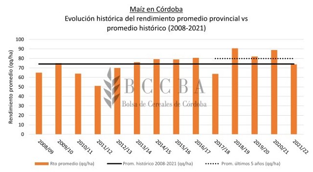 El rendimiento promedio alcanzado en la provincia teniendo en cuenta tanto valores en secano como bajo riego, fue de 73,7 qq/ha, generando un volumen de producción de 20,3 millones de toneladas. Ambas variables presentaron una caída del 17 % y 14 % respectivamente en comparación con la campaña 2020/21, que fue récord en producción.