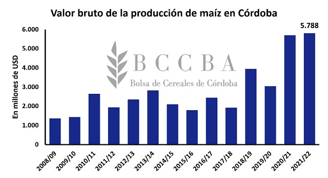 En la provincia de Córdoba, los resultados económicos de la campaña 2021/2022 fueron positivos. Por un lado, el valor bruto de la producción, entendido como la cantidad de divisas que ingresarían al país si se comercializara la producción en el mes de cosecha, presentó un aumento del 2% con respecto a la campaña previa posicionándose en un valor de USD 5.788 millones.