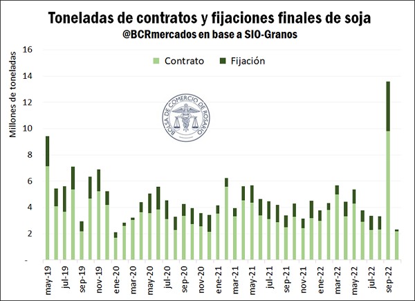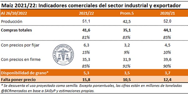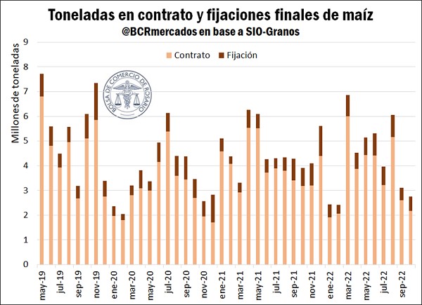 Por otro lado, se comercializaron cerca de 2,7 Mt de maíz el mes pasado, entre contratos y fijaciones. Este volumen se encuentra un 11% por debajo del mes pasado y casi un 30% debajo de octubre del mes pasado.