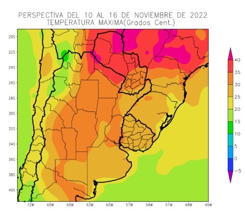 • El este del NOA, gran parte de la Región del Chaco, el este de Cuyo, el oeste de Corrientes, el norte y el oeste de la Región Pampeana y el sudeste del Paraguay observarán temperaturas máximas superiores a 30°C, con focos con valores superiores hacia el norte y otros inferiores.