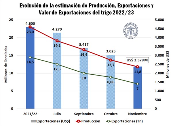 Como muestra el siguiente gráfico, con un volumen de ventas externas de 7 Mt, el costo de oportunidad total para el país (lo que dejará de percibir en exportaciones) sigue incrementándose y la Argentina pierde la posibilidad de ingresar divisas por 2.221 millones de dólares, comparado con lo exportado en el ciclo 2021/22.