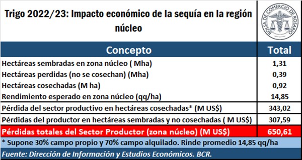 Estos US$ 650 M se componen de, por un lado, el valor de la pérdida adjudicada a las hectáreas perdidas (no cosechadas) debido a los efectos adversos del clima que se estiman en US$ 307 millones; mientras que el efecto de una baja en el rinde efectivo y la consecuente caída del margen bruto registrado en las 920.000 hectáreas restantes suman otros US$ 343 millones.