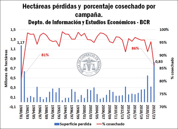 A su vez, en términos de la superficie que no llegará a trillarse a nivel nacional, se estima que la pérdida tanto en porcentaje como en cantidad de hectáreas es la más alta de los últimos 40 años y totaliza alrededor de 830.000 ha. Hay que remontarse hasta el ciclo 1980/81 para observar un nivel de pérdida de superficie mayor, cuya campaña presentaba un guarismo de 81% de trigo cosechado, frente al 86% de la campaña 2022/23.