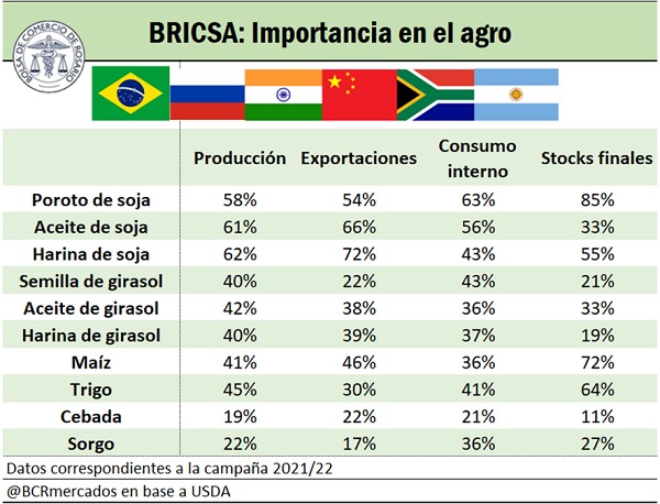 El BRICSA tendría un posicionamiento elevado a nivel agroalimentario: China e India como principales productores y consumidores globales de trigo, Rusia como su principal exportador. Brasil como principal exportador mundial de maíz y soja. China y Rusia como principales consumidores mundiales de cebada. El principal depósito mundial de maíz y soja, con China como epicentro. Rusia y Argentina como jugadores globales en la exportación de aceite de girasol. Enormes volúmenes de análisis adicionales pueden realizarse en vista de la importancia de estos mercados de producción y consumo de productos agrícolas.