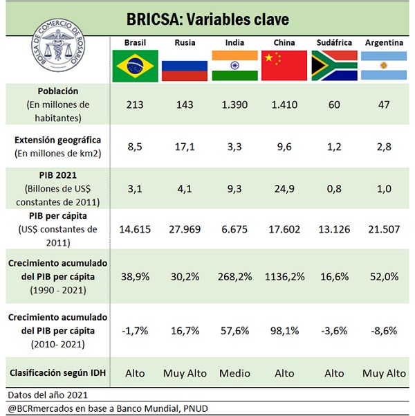 Con cerca del 27% de la superficie terrestre y el 31% del PIB mundial, el potencial ingreso de Argentina a este grupo ampliaría perspectivas para profundizar la inversión y comercio con estos países. Un ingreso que crece en un bloque que acumula el 41% de la población mundial podría permitir ampliar horizontes para los productos y servicios argentinos. Otro aspecto a tener en cuenta, es que estos países vienen mejorando sus índices de Desarrollo Humano (IDH1).