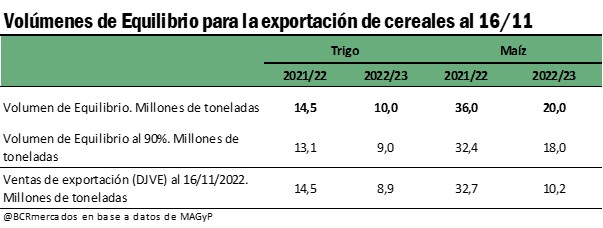 Si se observa el desenvolvimiento del sector exportador en los principales complejos para esta campaña 2021/22, al 17 de noviembre se han anotado DJVE por 33 Mt del complejo maíz, con el maíz en grano superando el 90% del Volumen de Equilibrio fijado oficialmente por el MAGyP, con 32,7 millones de toneladas. En el caso del trigo hay declaraciones de ventas externas por 15,2 Mt para todo el complejo, dentro de las cuales el trigo en grano alcanza el Volumen de Equilibrio oficial establecido de 14,5 Mt.