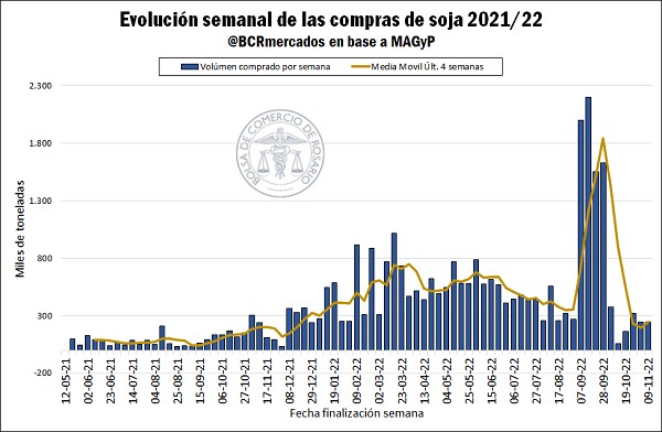 A partir de la implementación del “dólar soja”, el ritmo de comercialización interna se aceleró notablemente, negociándose tres veces el volumen promedio histórico mensual en septiembre. Entre nuevos contratos, fijaciones de mercadería y rectificaciones de contratos, se pudo observar un volumen total negociado en torno a 14,5 millones de toneladas de soja en el plazo de vigencia del programa. Luego, tras el vencimiento de la medida, el volumen comercial menguó de manera notoria, cómo era de esperarse. En términos de volumen comercializado a en la última semana, del 03/11/2022 al 09/11/2022, se realizaron negocios por 250 mil toneladas de soja, con la industria comprando 240 mil toneladas y la exportación asegurándose las 10 mil restantes.