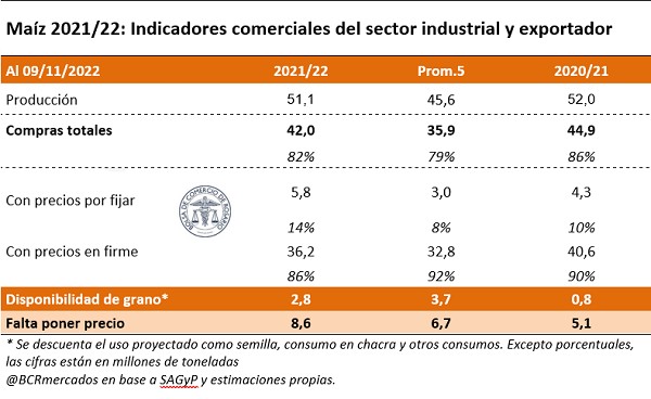 En plena siembra de la nueva campaña maicera, va quedando poco maíz por comercializar de la campaña 2021/22. Al 9 de noviembre, se informó que ya se habían comercializado 42 millones de toneladas de maíz, un 82% de los 51 millones de toneladas que se estima se produjeron a nivel país en la campaña (GEA – BCR).