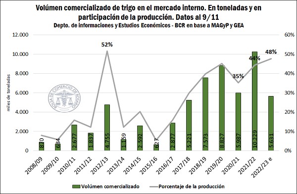 Trigo 2022/23. Situación Comercial: el volumen de mercadería comercializado a la fecha alcanza el 48% del volumen que se espera producir en la campaña 2022/23