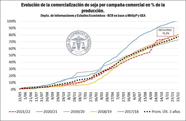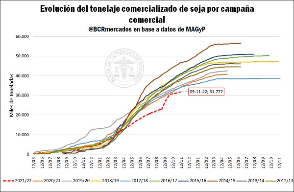 Realizando un análisis “en valores absolutos” de grano vendido, sin contemplar en el análisis las producciones relativas de cada campaña, al 9 de noviembre, industriales y exportadores pactaron la compra de 31,8 Mt de soja (datos oficiales del MAGyP emitidos el 15/11/2022). Esto se ubica 2,3 millones de toneladas por debajo de la campaña previa, y el menor volumen comercializado a esta altura desde la 2008/09.