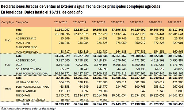 Situación comercial externa de los tres principales granos 2021/22: Las ventas externas de los tres principales complejos (soja, maíz y trigo) se ubican 2,7 Mt por debajo de la campaña pasada.