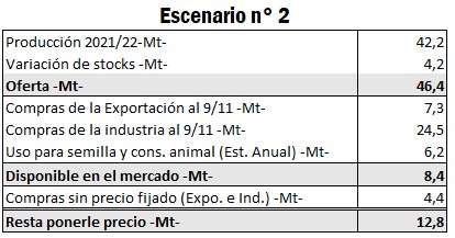 Escenario n°2: en este escenario, a la producción de la campaña 2021/22, le agregamos la diferencia entre el stock inicial y la estimación de stock final para la campaña (Δ stock = 4,2 Mt), lo que suma a la oferta total disponible. Luego procedemos de manera análoga al Escenario n°1.
