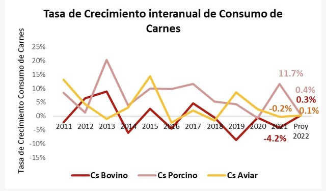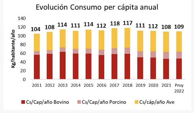 Al 2022 se proyecta un consumo de 48 kilos de carne vacuna, 45 kilos de carne aviar y 16 kilos de carne porcina. En 2012, año en que el consumo por habitante alcanzó un valor semejante al proyectado para el actual 2022, los volúmenes consumidos por habitante por año de carne vacuna fueron de 59 kilos, 40 kilos de carne aviar y casi 9 kilos de carne porcina, diferente distribución de kilos respecto a lo proyectado para 2022. Se observa una complementariedad entre carnes, donde, comparando 2012 a 2022, se sustituyen 11 kilos de carne vacuna, por 5 kilos de carne aviar y más de 6 kilos de carne porcina.
