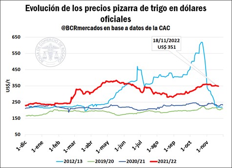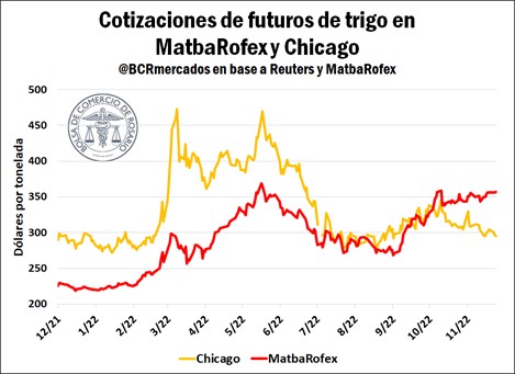 Si comparamos la evolución de las cotizaciones de futuros de trigo según MatbaRofex para la plaza doméstica (posición noviembre 2022) contra los futuros de trigo de mayor volumen operado de Chicago, vemos que, al 22 de noviembre, el precio del cereal en el país norteamericano anotó US$ 295/t, mientras que a misma fecha los precios pizarra de Rosario cotizaban a US$ 351/t.