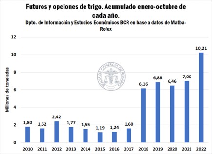 Otro dato que se desprende de la situación macroeconómica de la nueva campaña del trigo viene de la mano del valor casi duplicado en la cobertura de futuros y opciones de trigo para el mes de octubre. Como indica el siguiente gráfico, el décimo mes del año alcanzó un valor récord en transacciones de futuros y opciones de MatbaRofex e hizo que en el acumulado anual (enero-octubre), el 2022 sea el año con mayores coberturas para el cereal hasta el momento.