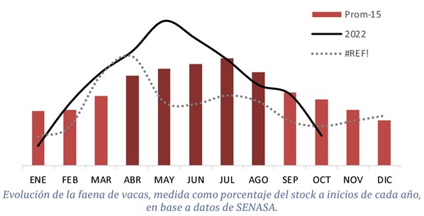 Si analizamos ese ritmo de esos envíos a faena a lo largo del año, vemos que este este año se produjo cierto adelantamiento de los descartes respecto del patrón de años anteriores, siempre medidos en relación al stock inicial. En efecto, el dato de octubre refleja una baja más pronunciada respecto de la curva promedio, probablemente también influenciado por la baja de valores registrada en el mercado.