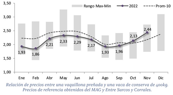 En efecto, hasta agosto y parte de septiembre, reponer una vaquillona preñada medido en equivalente vaca de descarte, costaba entre un 5% y un 15% menos que el promedio. Esto es, con la venta de 2 a 2,3 vacas de descarte se podía comprar una vaquillona preñada. Esta relación, se revirtió a partir de octubre con la caída del valor de estos refugos, pero también por una revalorización de los vientres jóvenes, en especial durante el último mes con la llegada de las primeras lluvias. Actualmente, se necesitaría el equivalente a la venta de 2,4 vacas viejas para reponer una vaquillona preñada, valuada en unos $170.000 promedio.