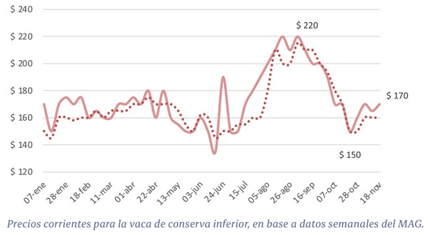 Habiendo tocado un piso a fines de octubre, la vaca de conserva en el MAG logra recuperar casi un 30% de lo perdido desde inicios de septiembre. Al cierre de la semana pasada, el piso para la categoría se afirmaba en torno a los $170 el kilo, lo que refleja una mejora de unos $20 o 13% respecto de los mínimos registrados tan solo tres semanas atrás.