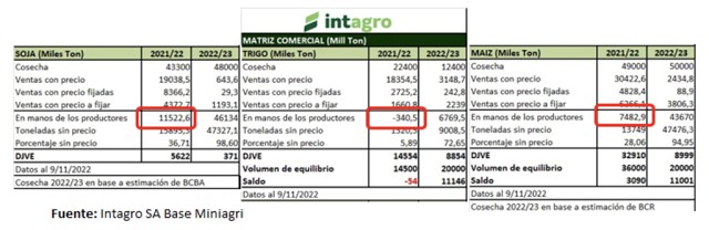 Como vemos en el gráfico, la soja como producto con menor incidencia inflacionaria (dado que se exporta en casi su totalidad), es el elegido para generar divisas con 11,5 Millones de tns para ser comercializadas.