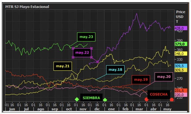 Mirando para adelante, y haciendo foco en soja 22/23. La soja mayo se mantiene en precios superiores de otras campañas en época de siembra.