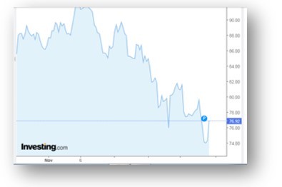 Después de haber alcanzado su pico el día 4 de noviembre (USD 92,61), este lunes quedó en USD 76,33. Nada menos que una baja cercana al 18%, en tan solo 24 días corridos.