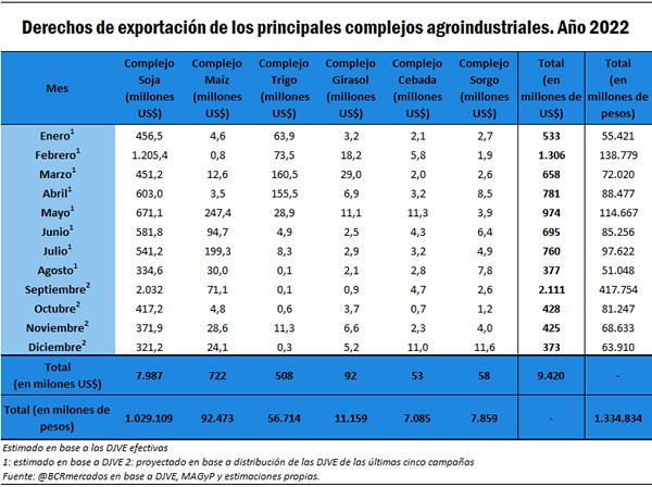 A lo largo de esta campaña 2021/22, el trigo aportó más de US$ 607 millones en derechos de exportación (DEX), de acuerdo con estimaciones propias de la BCR. Desde diciembre del 2021 hasta el recién terminado mes de noviembre, el trigo fue el tercer mayor aportante de derechos de exportación, en vista de su importancia productiva y la alícuota del 12% que recae sobre su comercialización con el exterior.