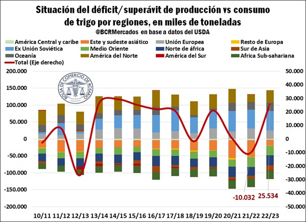 Resumiendo, el entramado geopolítico que se observa en el comercio internacional para este ciclo está configurado el origen y el destino del trigo de la nueva producción, lo que parecería indicar que en la 2022/23 el mercado mejoraría su balance entre oferta y demanda mundial respecto a los anteriores ciclos, aunque hacia el interior del balance regional triguero lo que se está produciendo es una reorganización de los destinos del trigo para el abastecimiento de una demanda que se proyecta casi constante en este período.