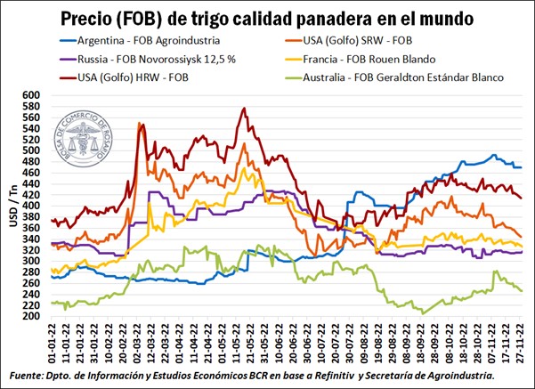 Debido a la reciente cosecha y la afluencia del cereal australiano, el precio FOB de este país al 27/11 del corriente año se posiciona como el más competitivo anotando US$246/t, le sigue el trigo ruso y el francés, con US$ 316/t y US$ 328/t, respectivamente. Por encima de la media se encuentra el trigo de invierno de EE.UU., con valores de US$ 344/t y US$ 415/t en sus dos variantes, y último en competitividad se posiciona Argentina con un FOB que llega los US$ 470/t.