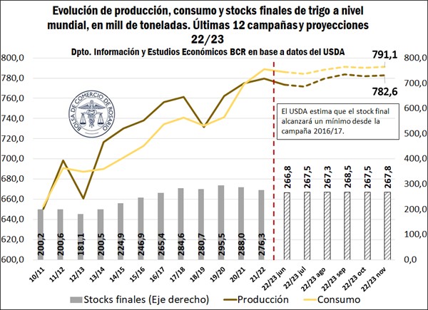 El escenario del mercado de trigo 2022/23 encuentra al mundo de cara a una oferta con abultadas producciones en varios exportadores importantes, y mermas considerables para otros jugadores clave. Mientras tanto, el consumo se posiciona por tercer año consecutivo por encima de la producción. Esto deja a los stocks globales de esta campaña en mínimos desde hace, al menos, cinco ciclos.
