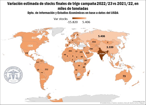Por último, si se analiza la variación de stocks finales para la campaña 2022/23 por países, se observa que India, el norte de África, Argentina, y en menor medida, América del Norte serán los que presenten la merma más sustantiva, en sintonía con el magro resultado productivo. China, por su parte, obtendría una suba de stocks de 3,3 Mt, a diferencia de la baja de 3,1 Mt mostrada en la campaña 2021/22, aunque en dicho caso por un consumo interno que ha caído de los niveles alto que se expresaban en términos históricos.