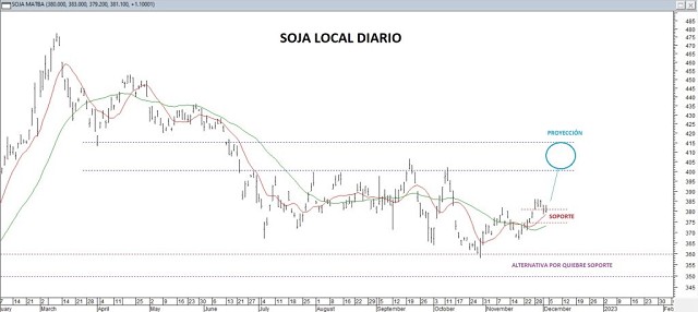 Tomando como referencia el precio de la soja a cosecha, mayo/2023, consideramos que en la medida que la zona de soporte en torno a los 380-373 dólares, pueda contener el recorte de las últimas sesiones, habrá posibilidades que se habiliten hacia las próximas semanas nuevos avances, buscando superar máximos de 385-386 dólares, para luego escalar hacia objetivo en la zona de 400-415 dólares.